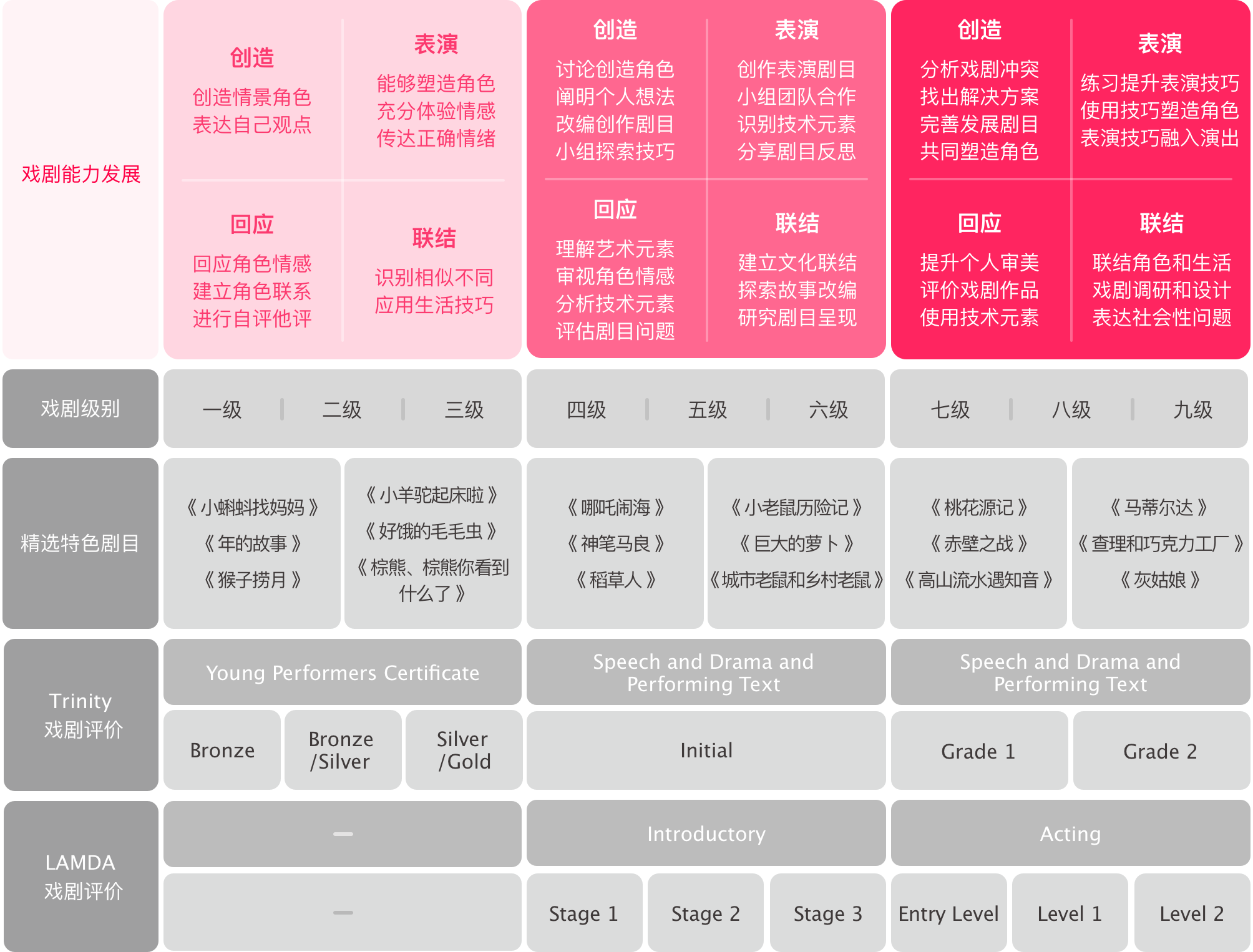 勵步戲劇(jù)是基于戲劇(jù)教育理(lǐ)念和(hé)美國NCCAS《藝術(shù)課程國家(jiā)标準》開(kāi)發,參考英國倫敦聖三一學院Trinity表演和(hé)戲劇(jù)能力評價标準,以及英國倫敦音(yīn)樂與戲劇(jù)藝術(shù)學院LAMDA戲劇(jù)評價标準,并結合中國兒童戲劇(jù)教育的現狀和(hé)兒童戲劇(jù)教學的相關研究,而搭建的完整體(tǐ)系。
